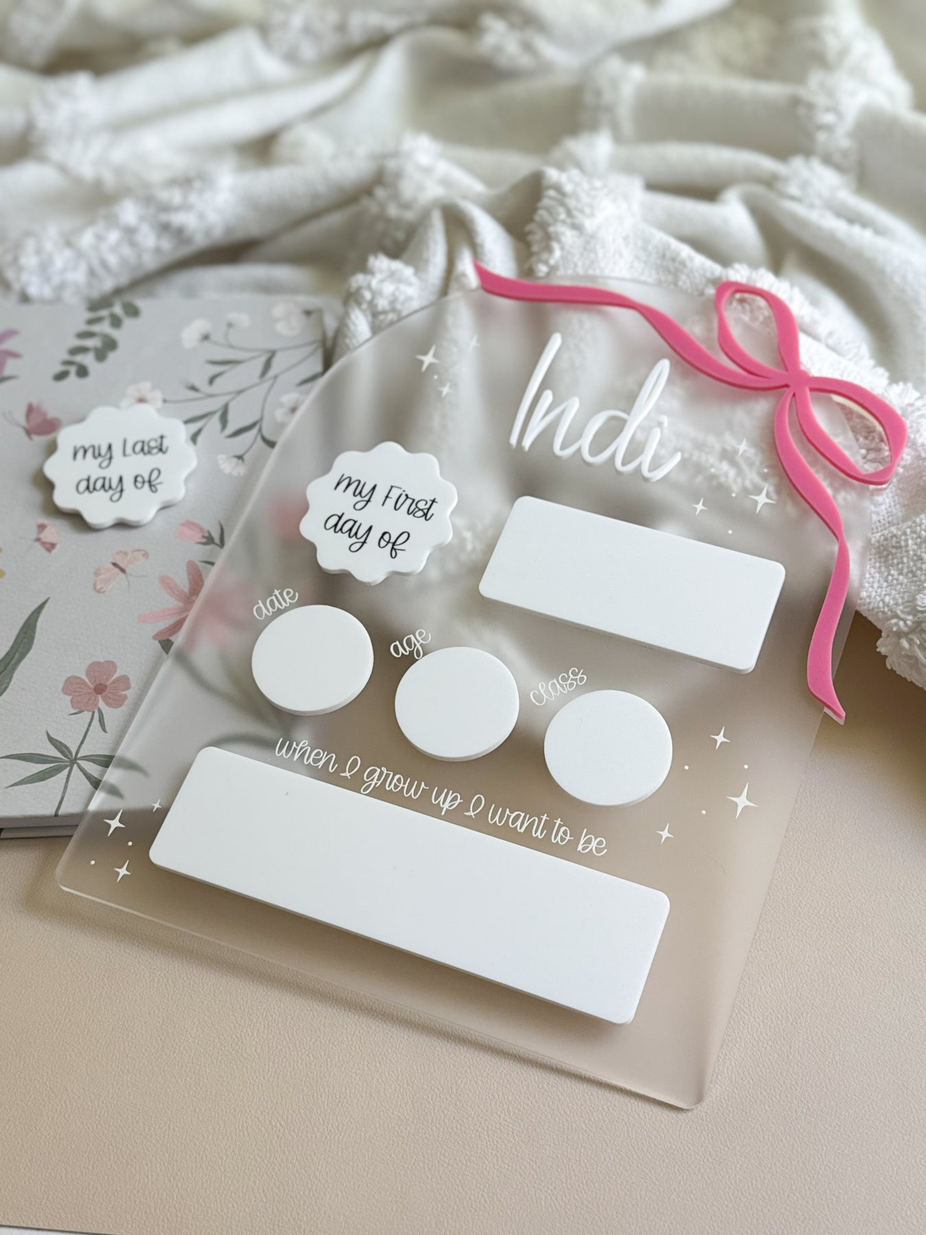 Capture your child’s school journey and preserve those special memories with our beautifully crafted Acrylic First Day Board, featuring a layered acrylic bow. Perfect for parents and teachers alike, this keepsake turns every first day of school into a moment you’ll treasure forever.