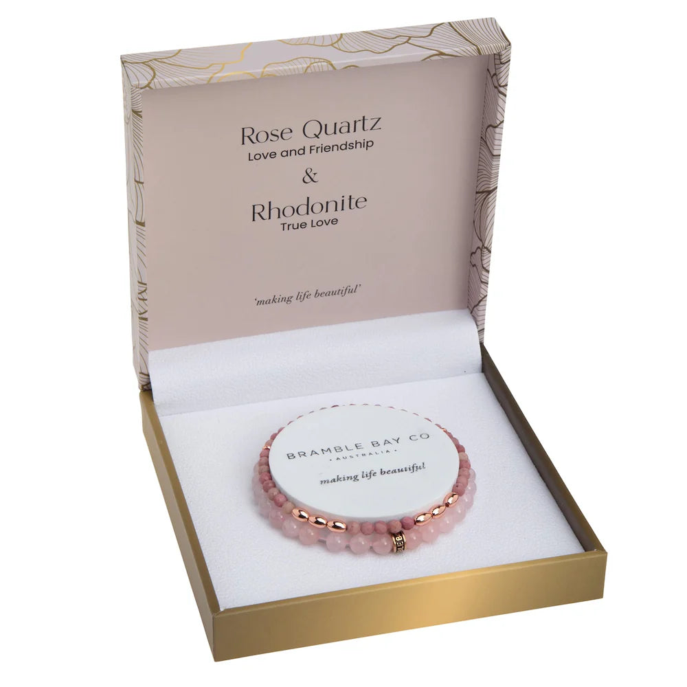 Embrace balance and love with our Rose Quartz & Rhodonite (Rose Gold) twin bracelet. A meaningful accessory that blends soft beauty with calming energy.