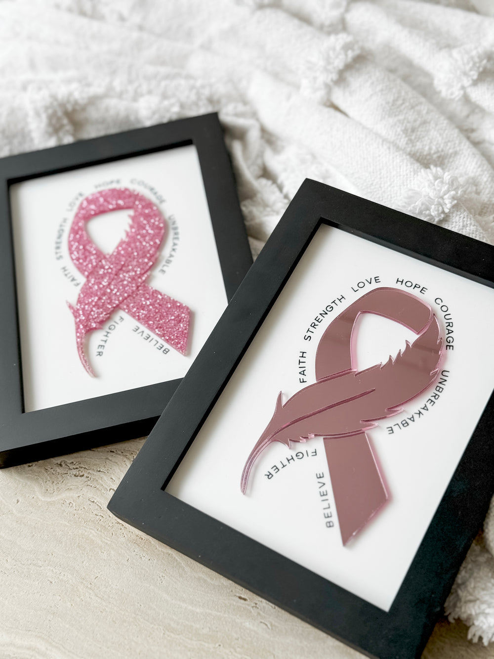 Introducing our elegant Pink Ribbon Affirmation Frame—a symbol of courage and support. Crafted with a delicate pink ribbon design centred around strong affirmation words, this product is more than just a frame—it's a statement of hope and solidarity.