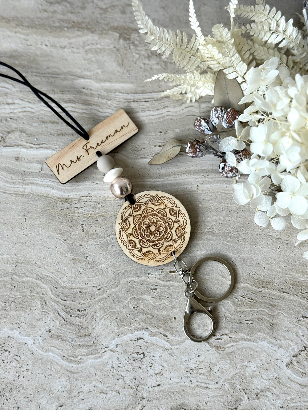 Our Mnadala Lanyard is made from three beads with an engraved plywood name disc and a keychain and clip.