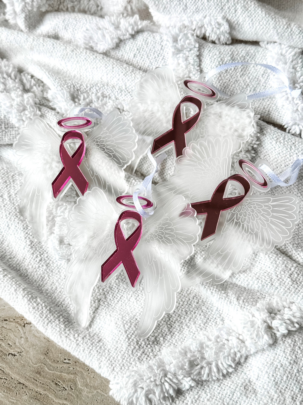 - your choice of colour pink ribbon and halo on an engraved frosted clear angel wing base