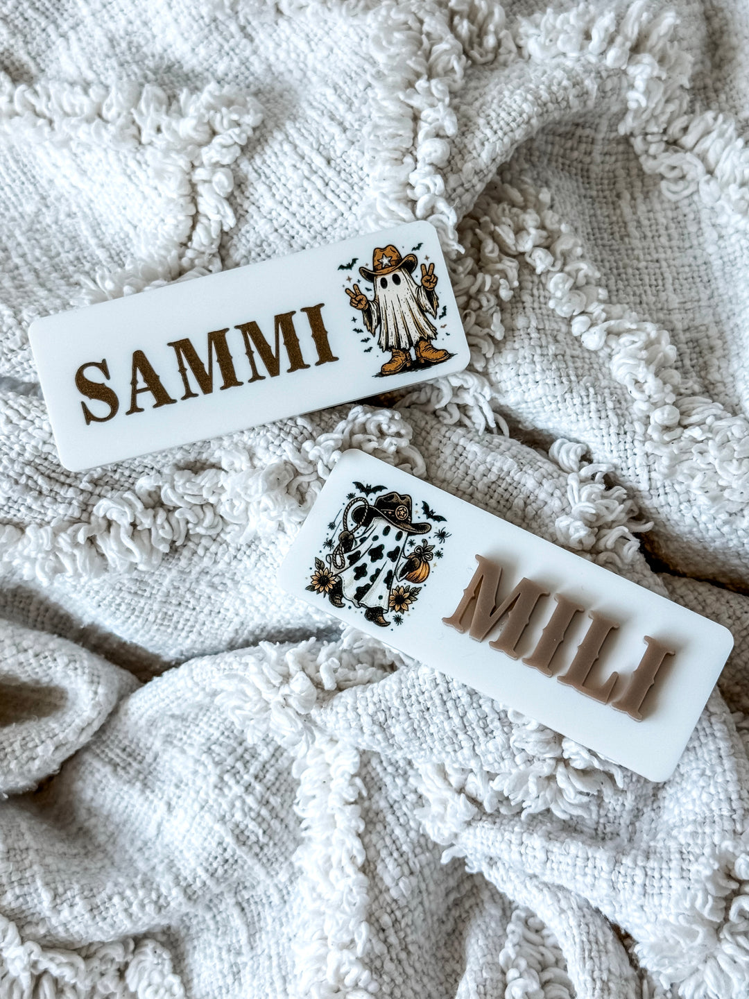 The badge font will be as per the product you purchase through; however, this photo explains the difference between a Full UV print vs Layered Acrylic for name and UV print for occupation