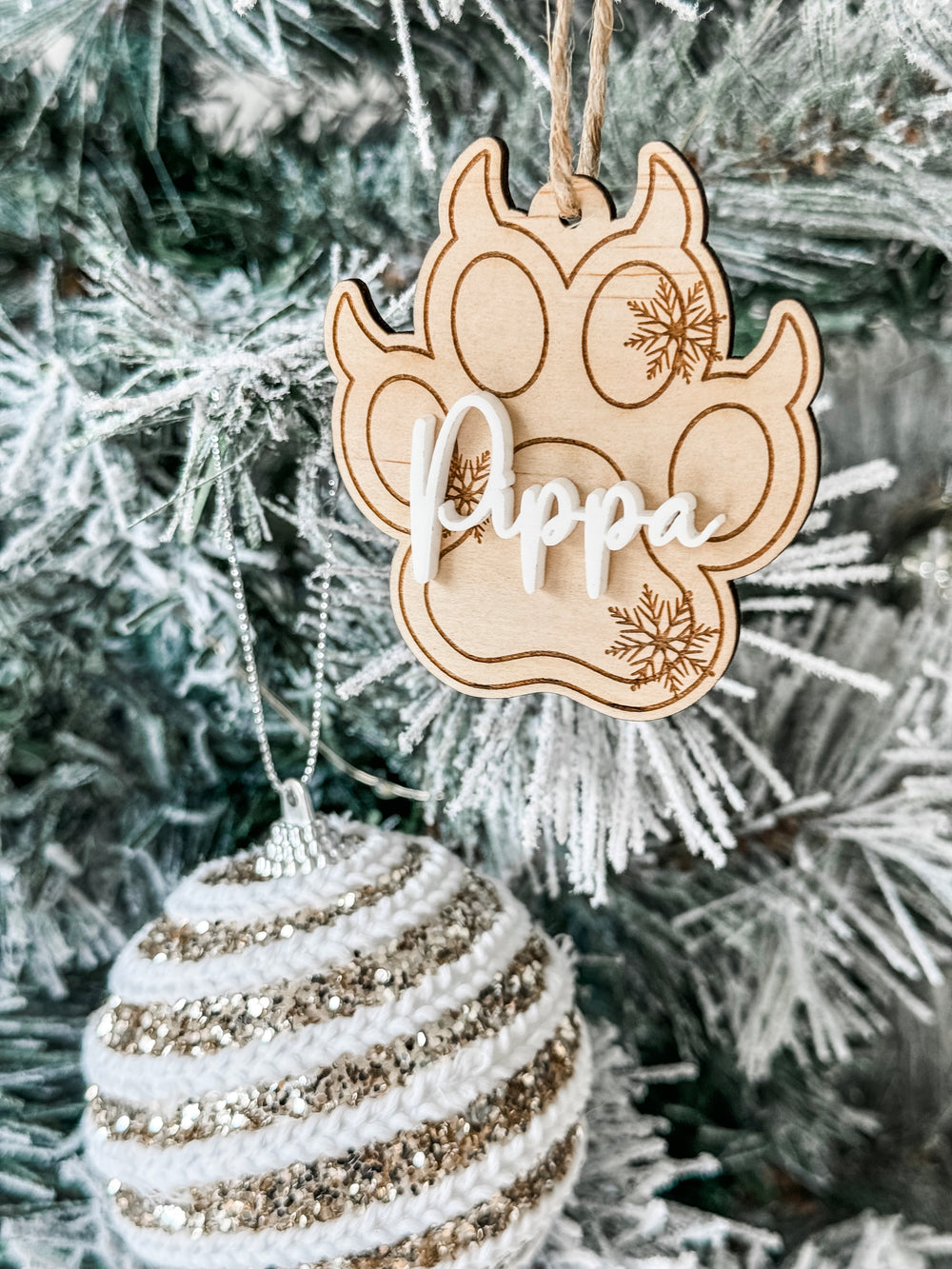 Wooden engraved cat snowflake ornament with layer cat's name in white acrylic.