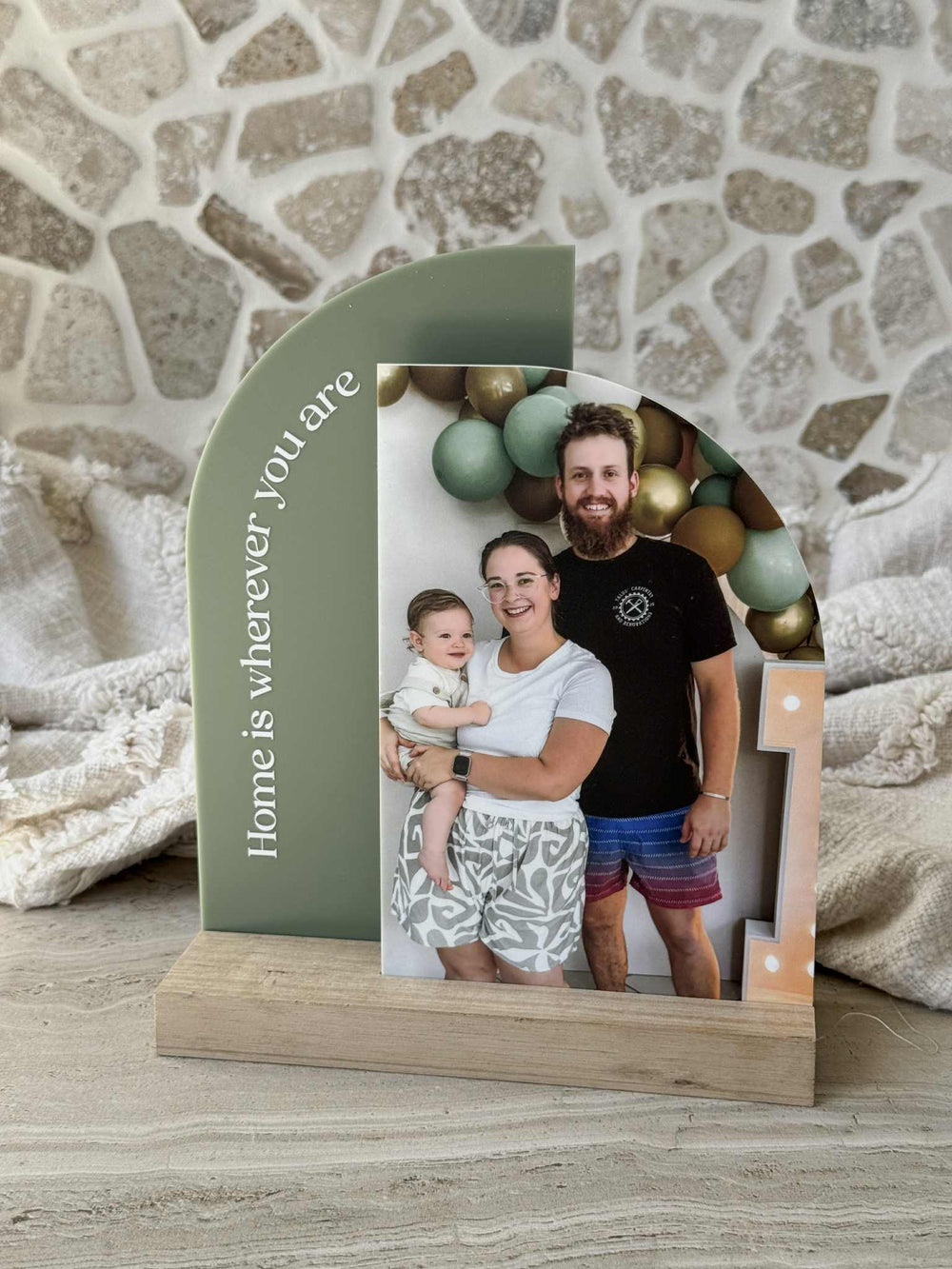 A heartfelt way to display your favourite photo and a special message. Our Double Arch Photo & Text Stand is a beautiful blend of modern design and timeless sentiment. Your chosen photo is UV printed directly onto the arched acrylic, paired with a second colour-matched arch featuring your custom text.