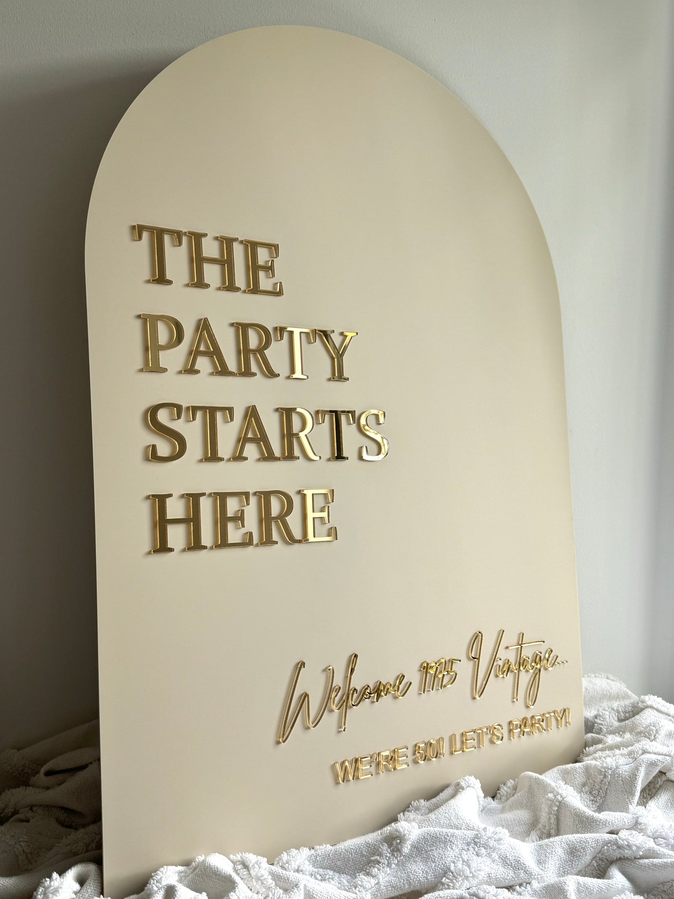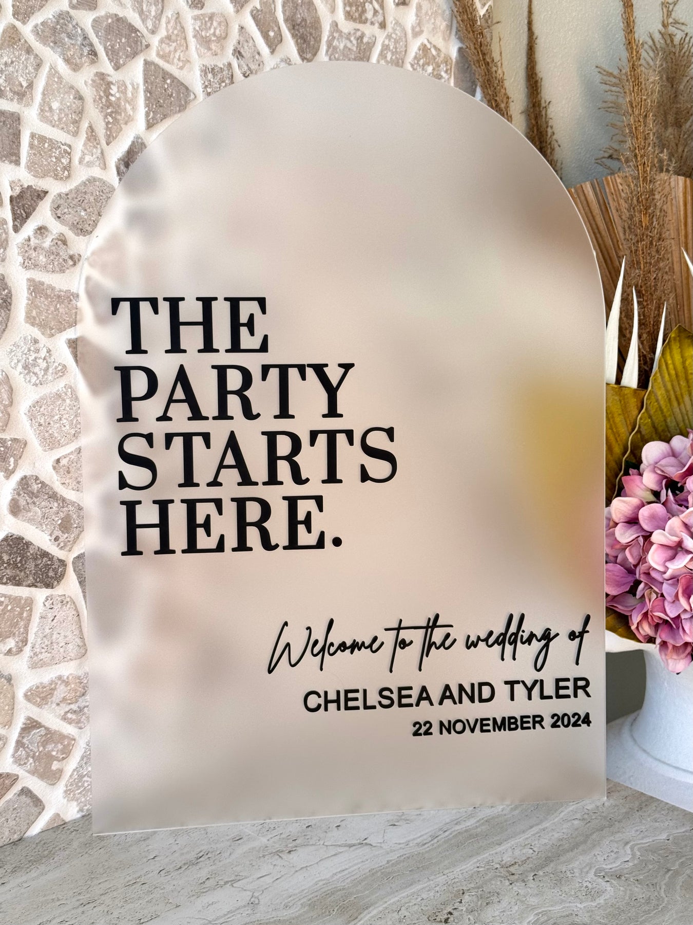 Set the tone for your celebration from the moment guests arrive with our “The Party Starts Here” Acrylic Arch Welcome Sign. Designed to create a stylish first impression, this statement piece adds a fun and welcoming touch to birthdays, engagements, hens parties, baby showers, and special events.