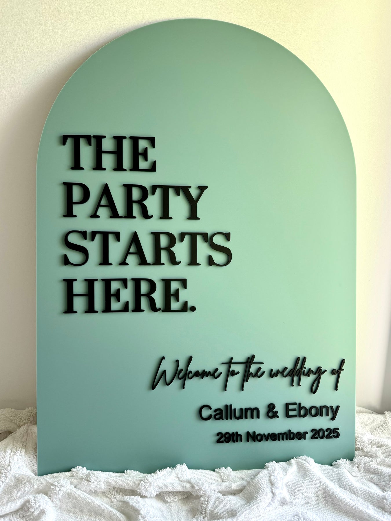 Crafted from high-quality acrylic, the modern arch shape brings a soft, elegant look while still feeling playful and celebratory. Each sign is professionally printed for a crisp, polished finish and can be customised with your choice of colours to suit your event styling.