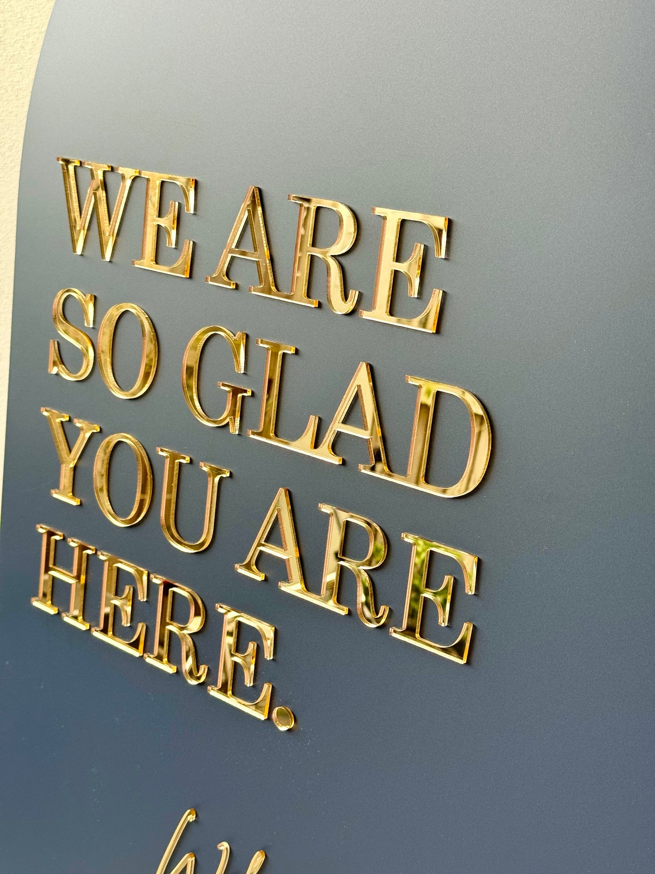 Acrylic Arch Welcome Sign - "We Are So Glad You Are Here" details:
